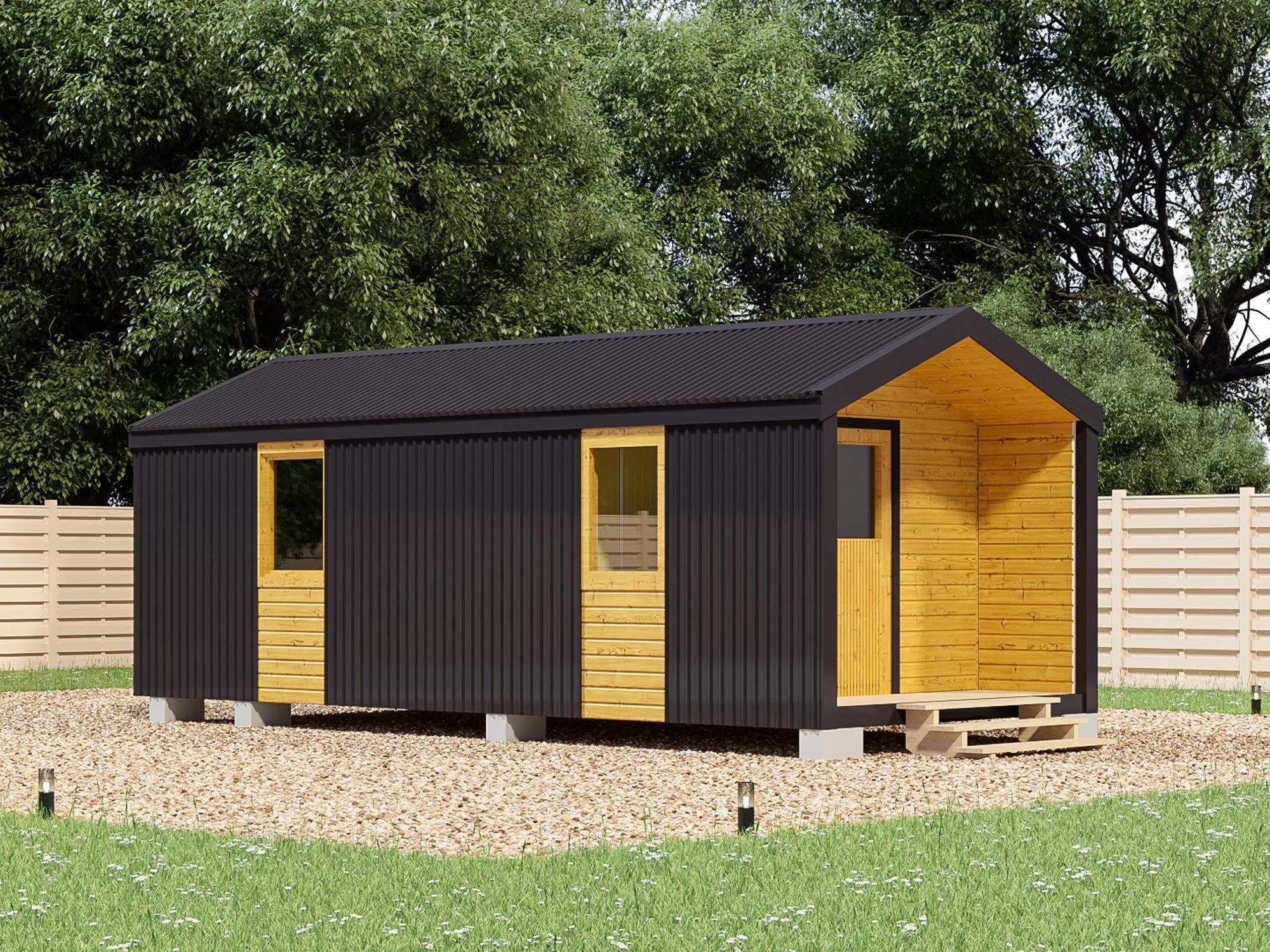 Хозблок для дачи в стиле хай-тек 6х3 со сборкой на участке6х318ДВП-Оргалит: